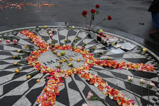 At the Strawberry Fields, this "imagine" mosaic is often decorated with flower petals into a peace sign. This memorial had been dedicated to John Lennon, one of the Beatles singers and a peace activist.